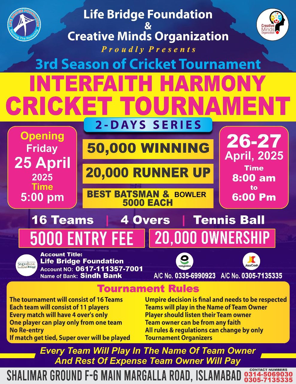 We are delighted to announce that the Season 3 Interfaith Harmony Cricket Tournament 2025 will take place on April, 2025. This exciting event is jointly organized by Life Bridge Foundation and Creative Minds Organization.