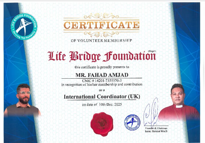 Life Bridge Foundation is delighted to announce that Mr. Fahad Amjad, S/O Muhammad Amjad, holding CNIC 14201-7355370-3 and currently residing in the United Kingdom, has been officially appointed as International Coordinator (UK).
